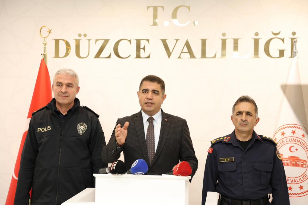 Düzce Valisi Selçuk Aslan, Ekim ayı Asayiş Bilgilendirme Toplantısı için İl Emniyet Müdürü İbrahim Ergüder ve İl Jandarma Komutanı Kıdemli Albay Mustafa Tetik ile birlikte kameraların karşısına geçti.