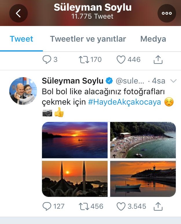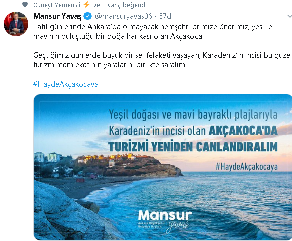 Takipçilerine paylaştıkları mesajlar ile Akçakoca’nın turizm açısından ne kadar önemli bir ilçe olduğunu dile getiren devlet erkânı sosyal medya aracılığı ile Akçakoca’nın yaralarının sarılması açısından büyük bir katkıda bulundu.