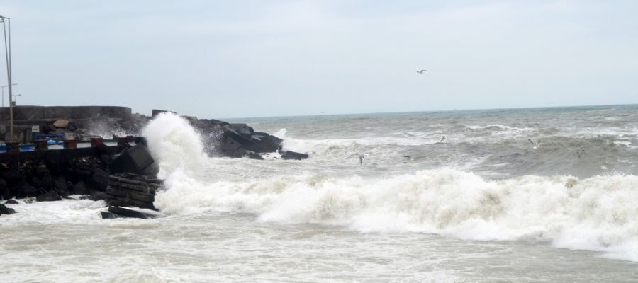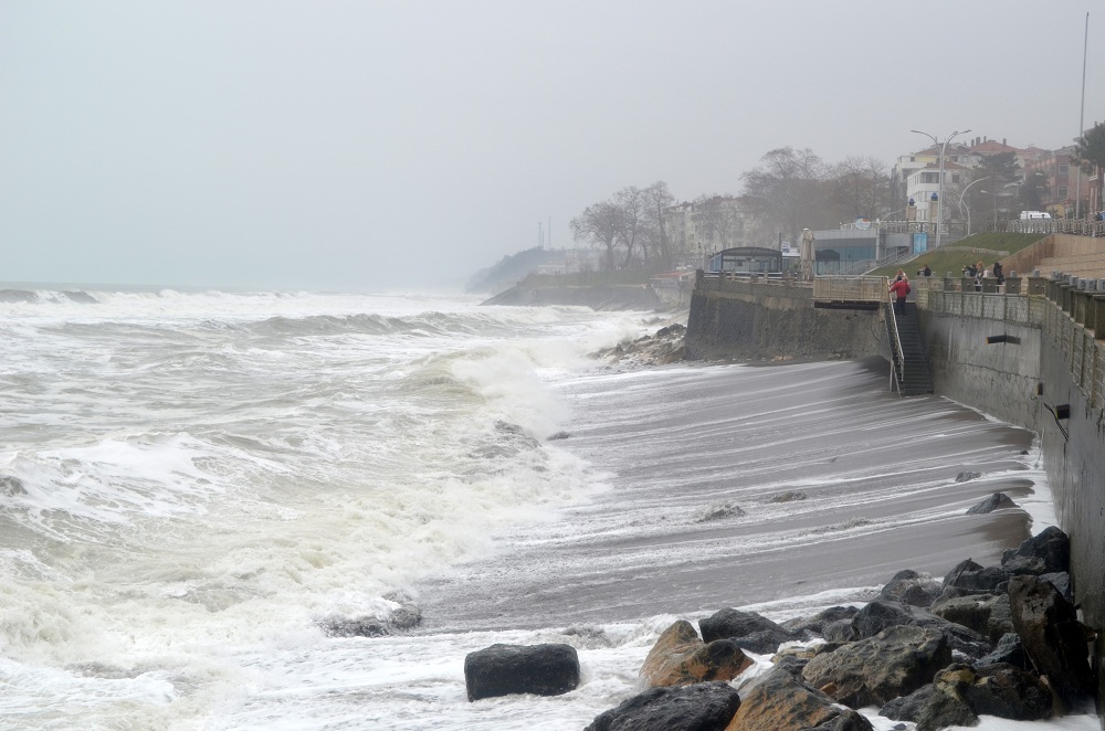 Sahil kesiminde poyraz, denizde dalga boyunun 4 metreye kadar yükselmesine yol açarken, Dalgalar sahil duvarlarını aştığı görüldü.